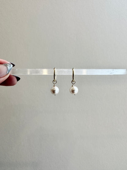 Product Description // Featuring a 2mm hollow gold hoop with a single pearl 10mm pearl dangling